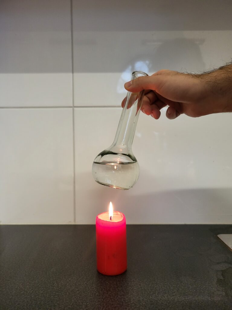 Mit Hilfe einer Kerze und einer mit Wasser gefüllten Glasflasche können wir den Feinstaub sichtbar machen.