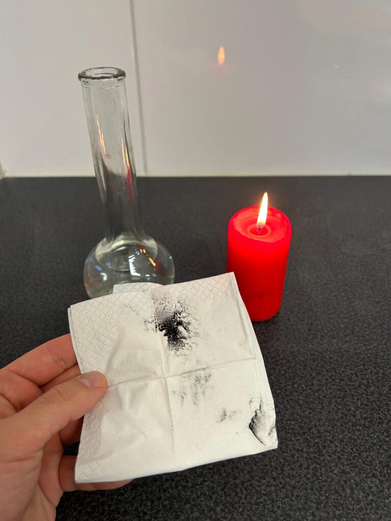 Indem wir mit einem Taschentuch über die dunkle Stelle wischen, können wir den frisch gebildeten Ruß genauer betrachten.