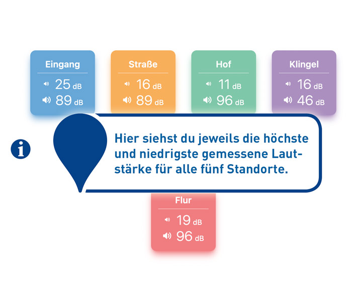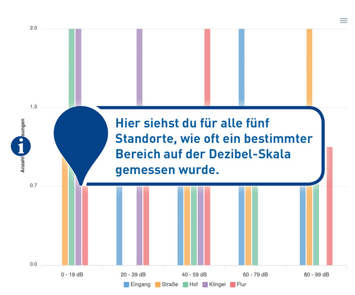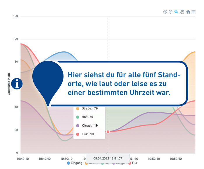 autstärke an 5 verschiedenen Orten gemessen. Die Messung erfolgte durch mehrere senseBoxen in Dezibel (dB). Alle Daten wurden durchgängig in die Lerneinheit hochgeladen.