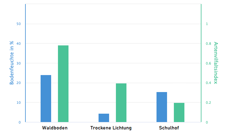 Ihr habt Daten zu den abiotischen Faktoren (Lufttemperatur, Bodenfeuchte, Versiegelungsanteil) sowie zur pflanzlichen Artenvielfalt gesammelt. Diese Daten werden als Säulendiagramme dargestellt. Diese könnt ihr nutzen, um eure Daten miteinander zu vergleichen.