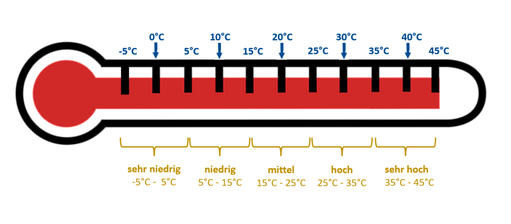 Die Lufttemperatur gibt an, wie warm oder kalt die Temperatur der Luft ist. Die Lufttemperatur wird in Grad Celsius (° C) angegeben. Zur Einschätzung der Lufttemperatur kann die folgende Abbildung genutzt werden.
